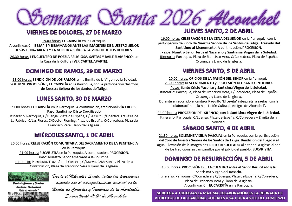 El Ayuntamiento de Alconchel hace público este BANDO sobre la PROHIBICIÓN DEL ESTACIONAMIENTO DE VEHÍCULOS CON MOTIVO DE LAS PROCESIONES DE “SEMANA SANTA” 2026.