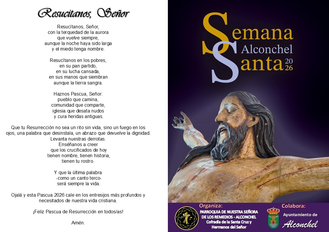 Damos comienzo a la SEMANA SANTA DE ALCONCHEL 2026, una de las celebraciones más arraigadas y emotivas de nuestra localidad, con su tradicional programación, acompañada este año por un cartel que destaca la solemne y sobrecogedora imagen del Santísimo Crucificado, símbolo de fe, tradición y devoción de todo un pueblo.
