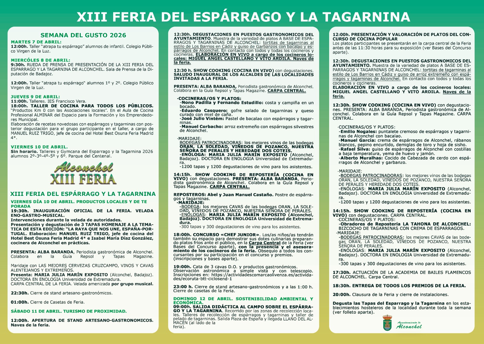 ¡Ya está aquí! Ya puedes echarle un vistazo al programa completo de la XIII FERIA DEL ESPÁRRAGO Y LA TAGARNINA DE ALCONCHEL. Se vienen días llenos de buen ambiente, comida rica y momentos para disfrutar con los tuyos.