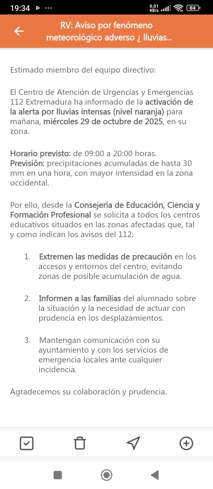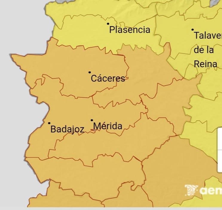 Aviso AEMET FMA por Lluvias Centro 112 amplía alerta Nivel Naranja a toda Extremadura. Precipitación acumulada en una hora 30mm desde día 29/10 a las 09:00 h a día 30/10/25 a las 00:00. Más información en web 112 y AEMET.