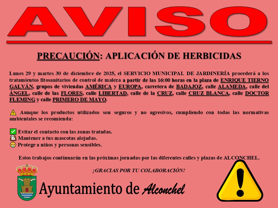 Hoy lunes 29 y mañana martes 30 de diciembre de 2025, el SERVICIO MUNICIPAL DE JARDINERÍA procederá a los tratamientos fitosanitarios de control de maleza a partir de las 16:00 horas en la plaza de ENRIQUE TIERNO GALVÁN, grupos de viviendas AMÉRICA y EUROPA, carretera de BADAJOZ, calle ALAMEDA, calle del ÁNGEL, calle de las FLORES, calle LIBERTAD, calle de la CRUZ, calle CRUZ BLANCA, calle DOCTOR FLEMING y calle PRIMERO DE MAYO.