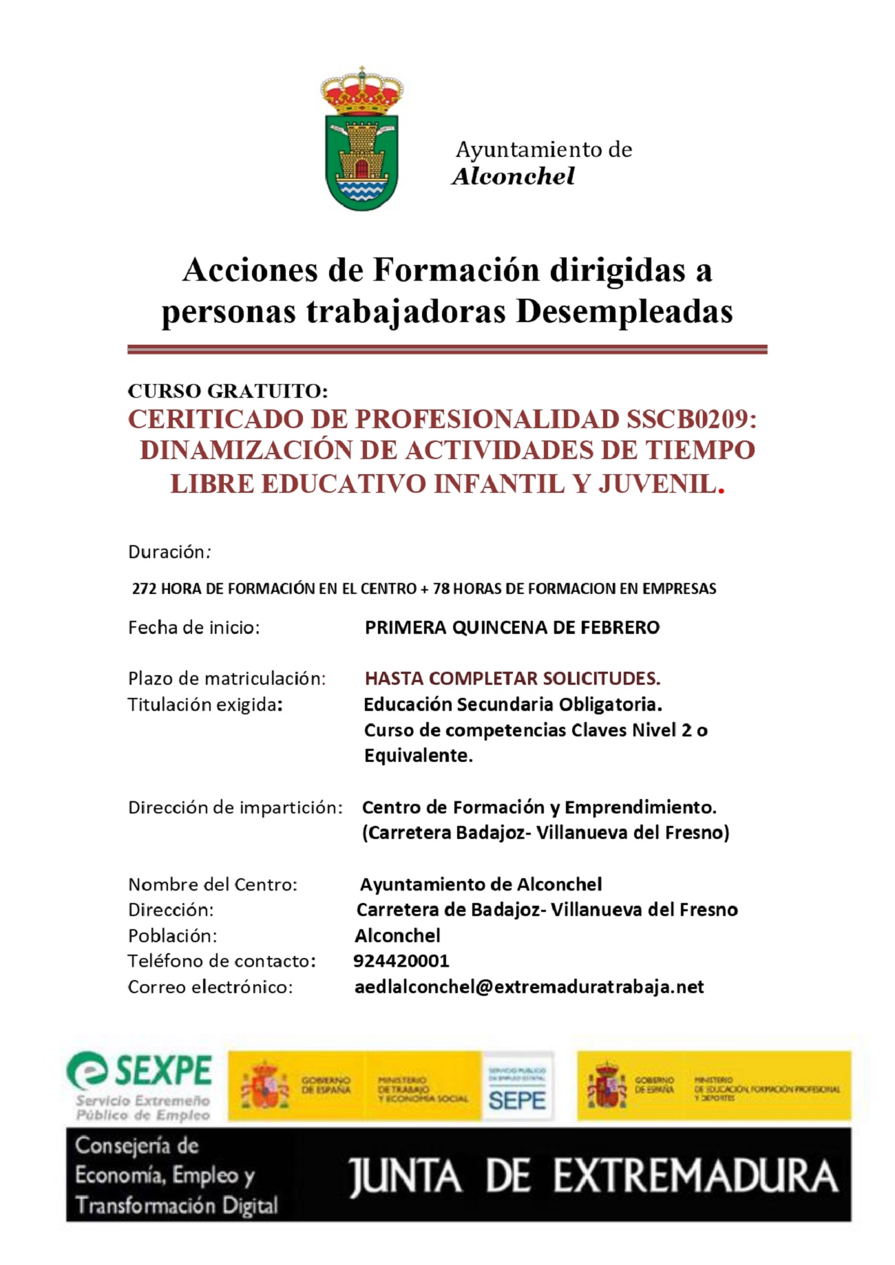 CONVOCATORIA DE EMPLEO: FORMADOR/A PARA IMPARTIR EL CURSO DE DINAMIZACIÓN DE ACTIVIDADES DE TIEMPO LIBRE EDUCATIVO INFANTIL Y JUVENIL EN ALCONCHEL 2026
