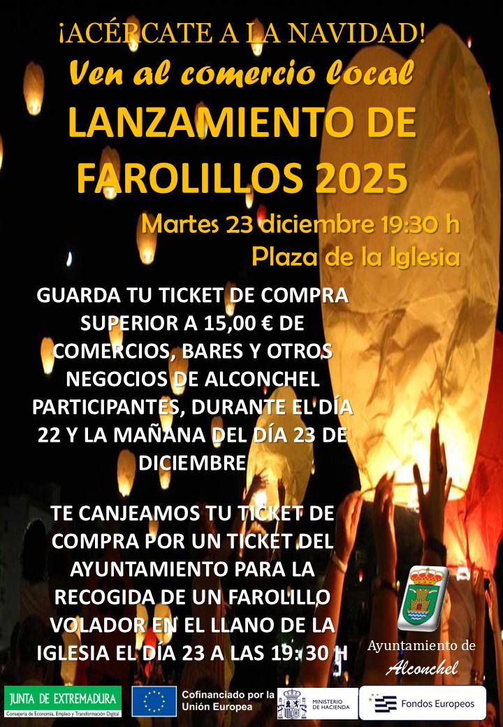 Martes 23 de diciembre, LANZAMIENTO DE FAROLILLOS VOLADORES, a las 19:30 horas en el llano de la Iglesia. INFORMACIÓN IMPORTANTE: ¿Cómo se utilizan los FAROLILLOS VOLADORES? El lanzamiento resulta más fácil si lo realizan dos personas, una sujeta el farolillo y la otra enciende la célula de combustible, por lo que es necesario llevar a la actividad un MECHERO y, seguir las instrucciones que aparecen en el farolillo.