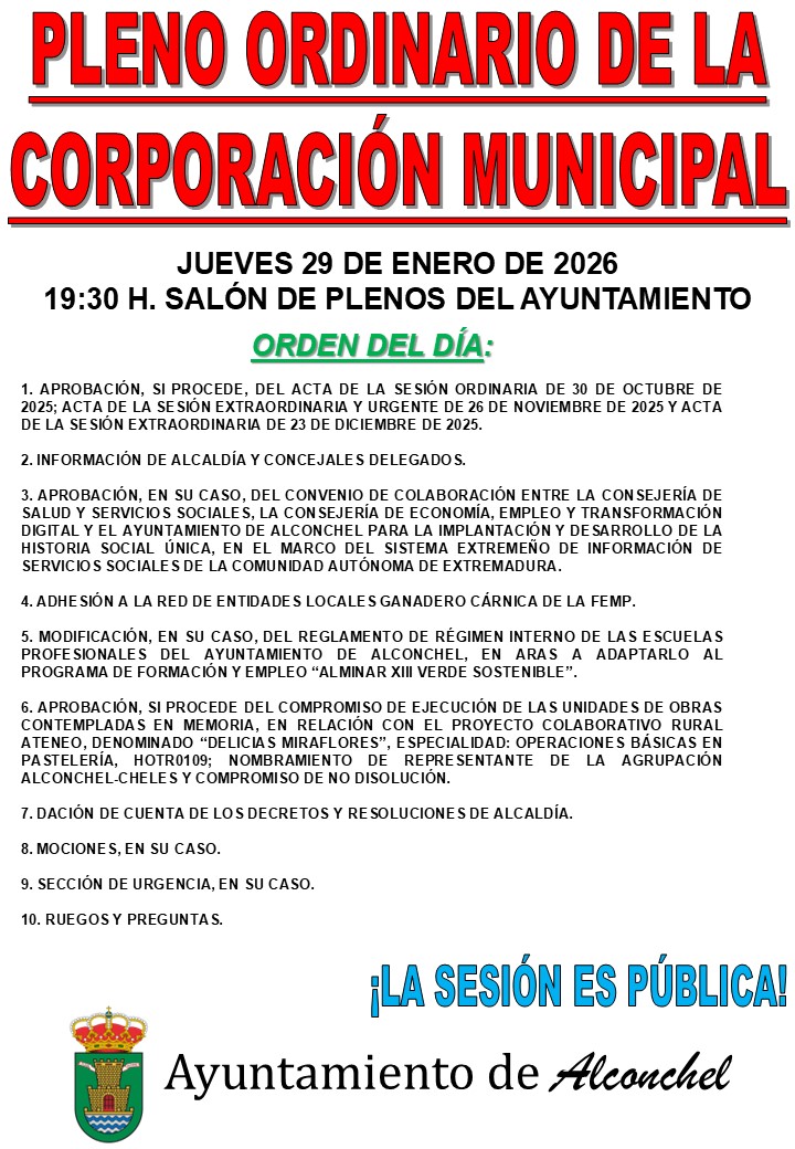 Mañana jueves 29 de enero se celebrará SESIÓN PLENARIA ORDINARIA en el SALÓN DE PLENOS DEL AYUNTAMIENTO DE ALCONCHEL, a las 19:30 horas, conforme al siguiente orden del día: