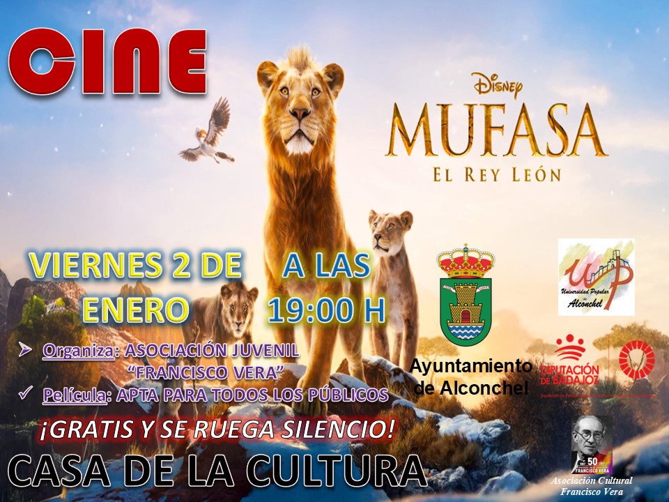 Mañana viernes 2 de enero, MUFASA – EL REY LEÓN, a las 19:00 horas en la gran pantalla del CINE de la CASA DE LA CULTURA.