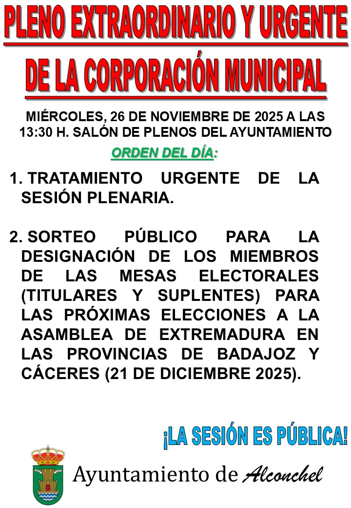 Mañana miércoles 26 de noviembre de 2025, SESIÓN PLENARIA EXTRAORDINARIA Y URGENTE, a las 13:30 horas en el SALÓN DE PLENOS del Ayuntamiento de Alconchel con el siguiente orden del día: