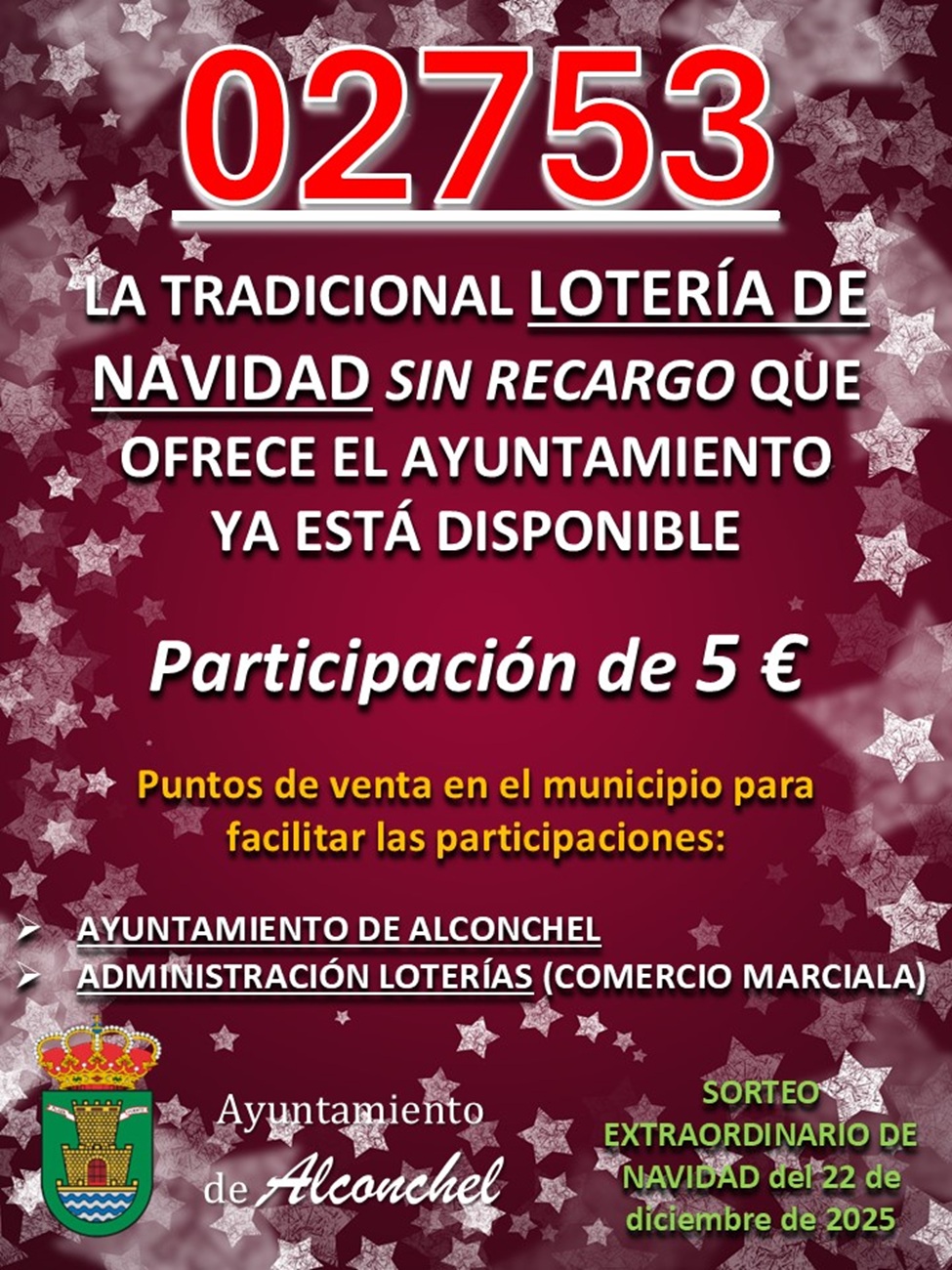 📢 Te ofrecemos como cada año, la tradicional LOTERÍA DE NAVIDAD DEL AYUNTAMIENTO sin recargo. Cada participación corresponde al número 02753 y tiene un importe de 5 euros para el SORTEO EXTRAORDINARIO DE NAVIDAD, que se celebra el lunes, 22 de diciembre de 2025.