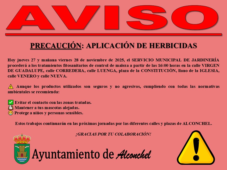 Hoy jueves 27 y mañana viernes 28 de noviembre de 2025, el SERVICIO MUNICIPAL DE JARDINERÍA procederá a los tratamientos fitosanitarios de control de maleza a partir de las 16:00 horas en la calle VIRGEN DE GUADALUPE, calle CORREDERA, calle LUENGA, plaza de la CONSTITUCIÓN, llano de la IGLESIA, calle VENERO y calle NUEVA.