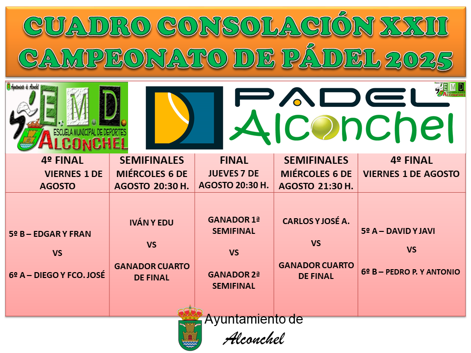 Hoy miércoles 30 de julio, se disputan los cuartos de final del CAMPEONATO DE PÁDEL de las 2 categorías.