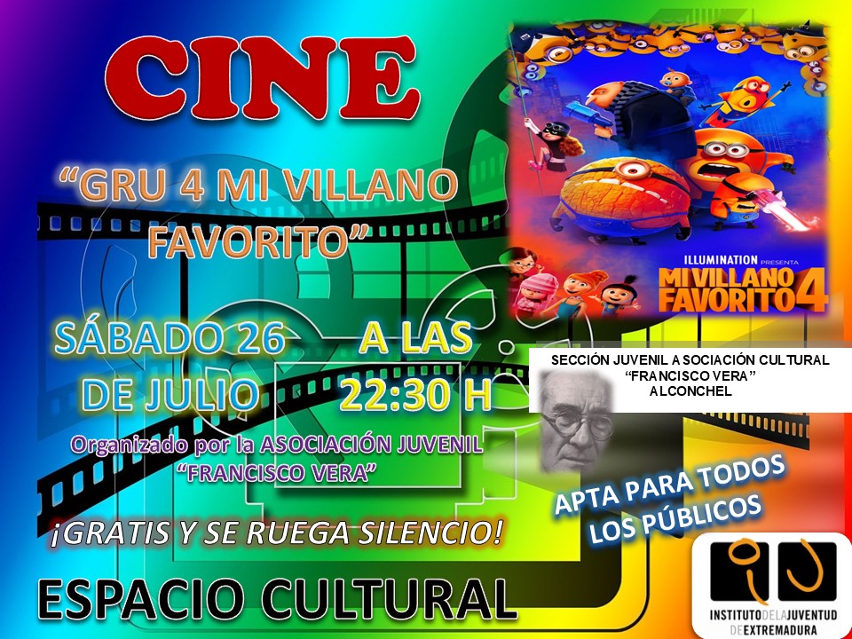 Tabmién este sábado 26 de julio, se proyectará gratuitamente la película de animación, aventura y ciencia ficción, GRU 4 MI VILLANO FAVORITO, a las 22:30 horas en la gran pantalla del CINE DE VERANO instalada en el ESPACIO CULTURAL (antiguas escuelas).